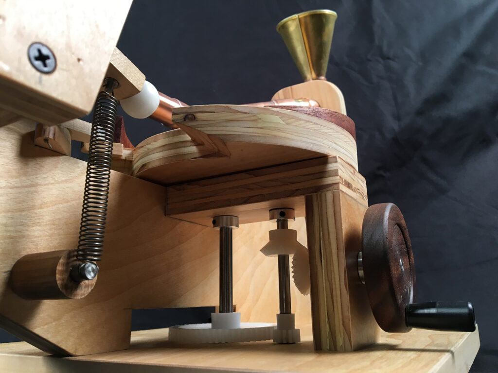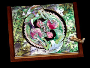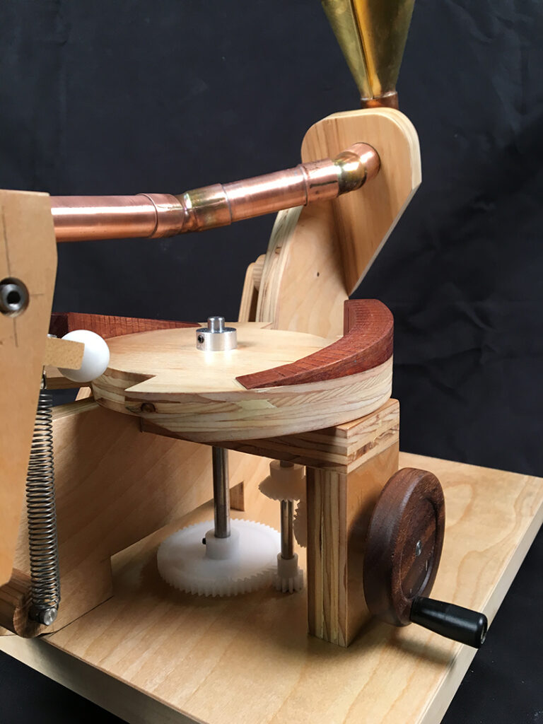 This interactive kinetic work was commissioned by the Morris Museum, in Morristown, NJ, as an educational outreach project, offered as enrichment for middle school STEAM programs. Each of the mechanisms on the lower panel section controls an animated feature of the dragon puppet. www.MorrisMuseum.org for museum info