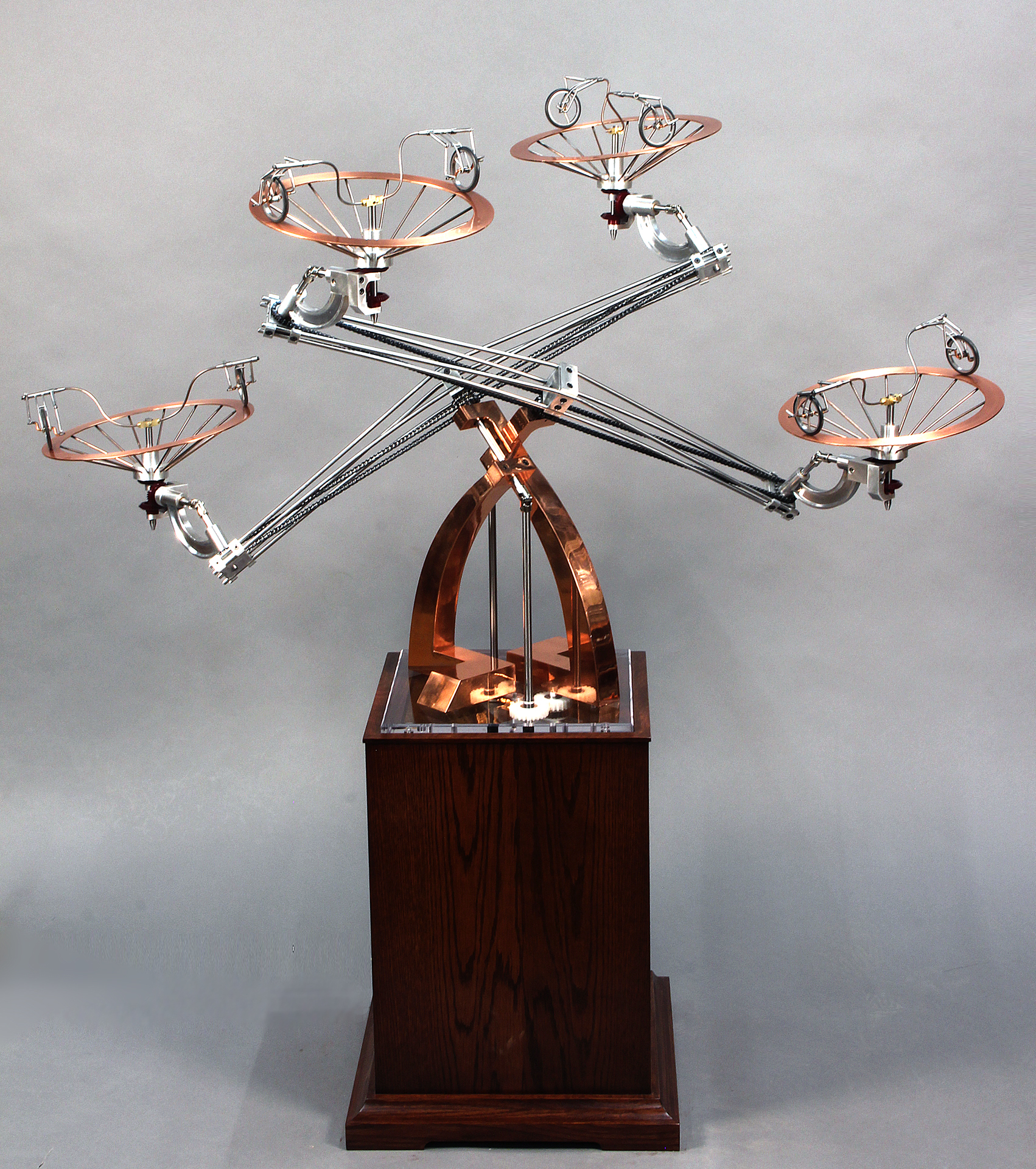 Note: The original “Tetra-Cycling,” exactly one-half the size of this work, made in 2008, was acquired by the late, celebrated composer, James Horner. It seemed a shame it would not likely be seen again. This work, in part, stands in tribute to James, with great appreciation of his enthusiasm for kinetic sculpture.